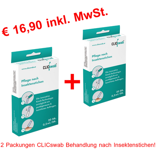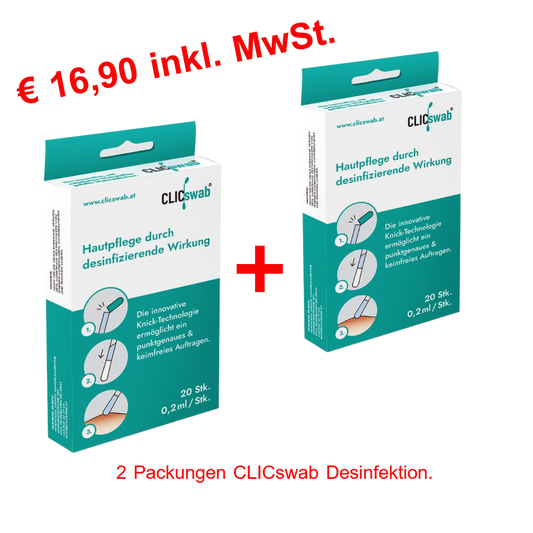 ClicSwab® ist ein innovatives, patentiertes Wattestäbchen, das mit einer vordosierten Lösung gefüllt ist. Durch einfaches Knicken der grünen Silikonkappe wird die Flüssigkeit freigesetzt und gelangt gezielt in die speziell geformte Wattespitze. So ermöglicht ClicSwab® eine hygienische, präzise und kontaktlose Anwendung – ideal für Wundversorgung, Desinfektion, Kosmetik, Warzenbehandlung, Fieberblasen, Zahnaufhellung und mehr. Perfekt für unterwegs oder die Hausapotheke.